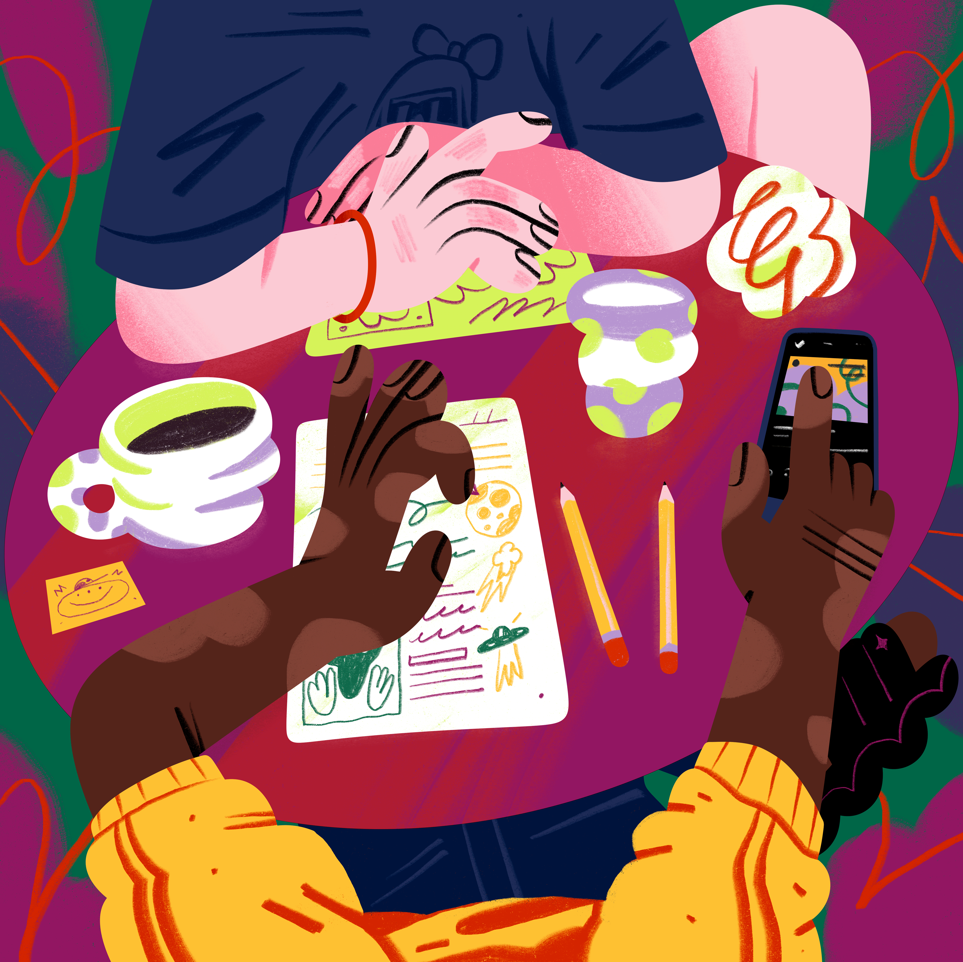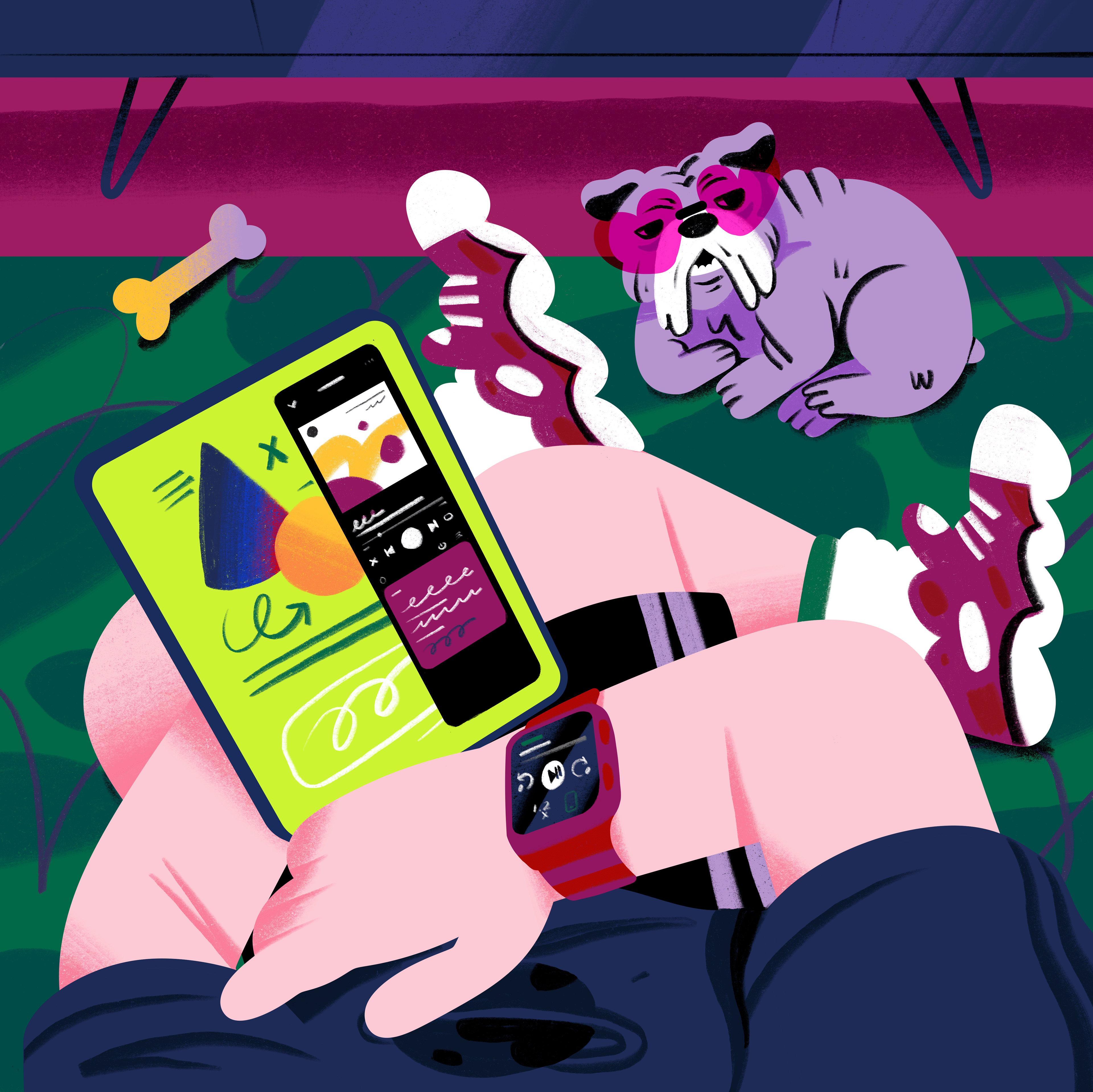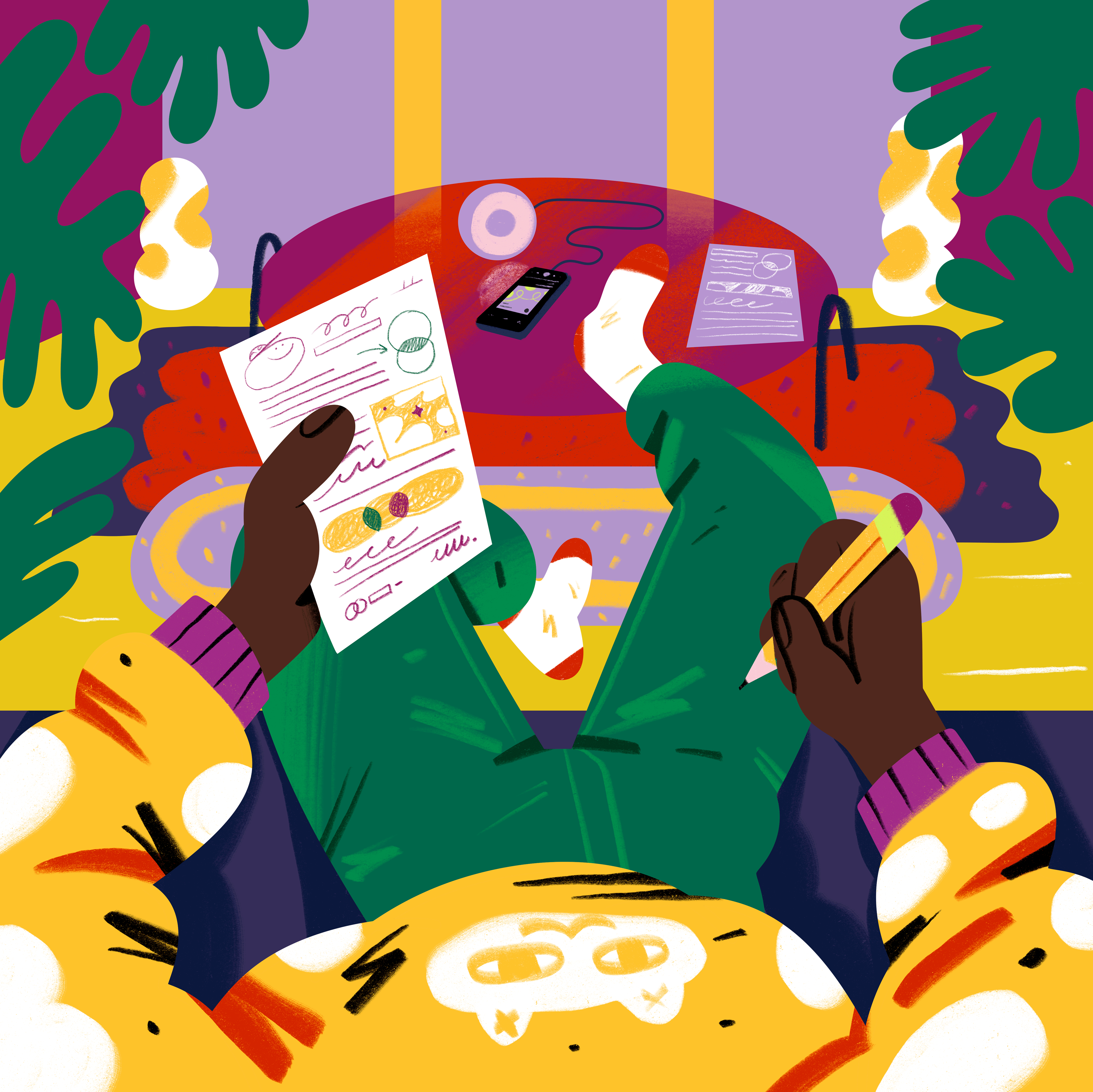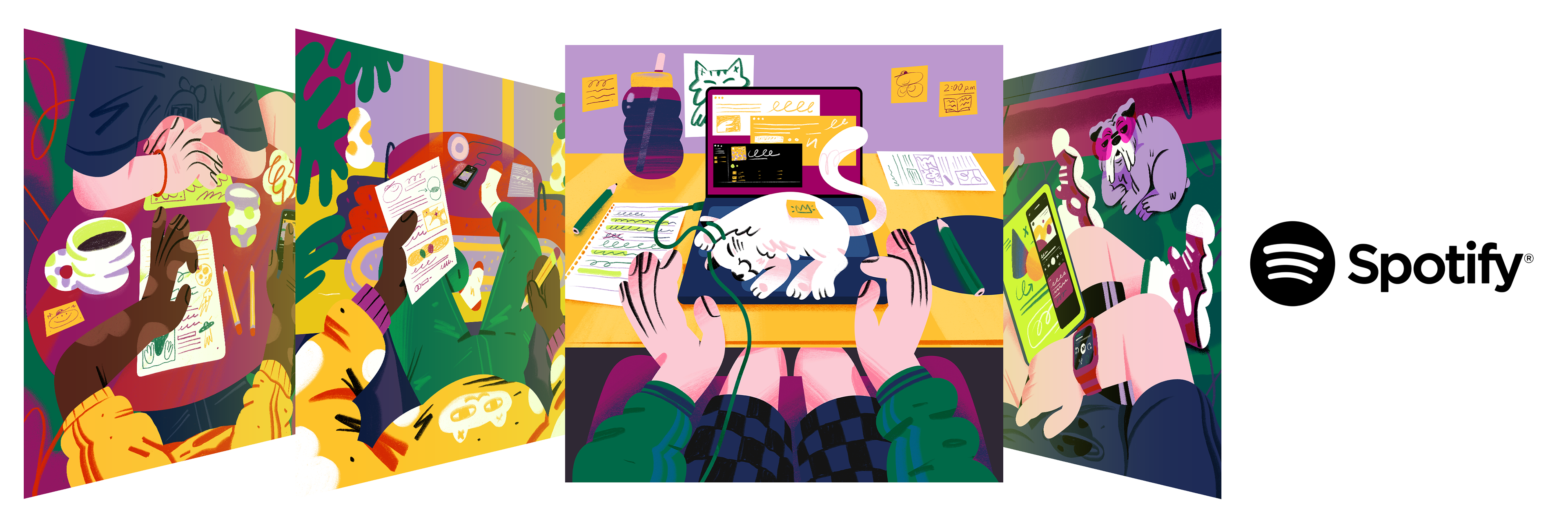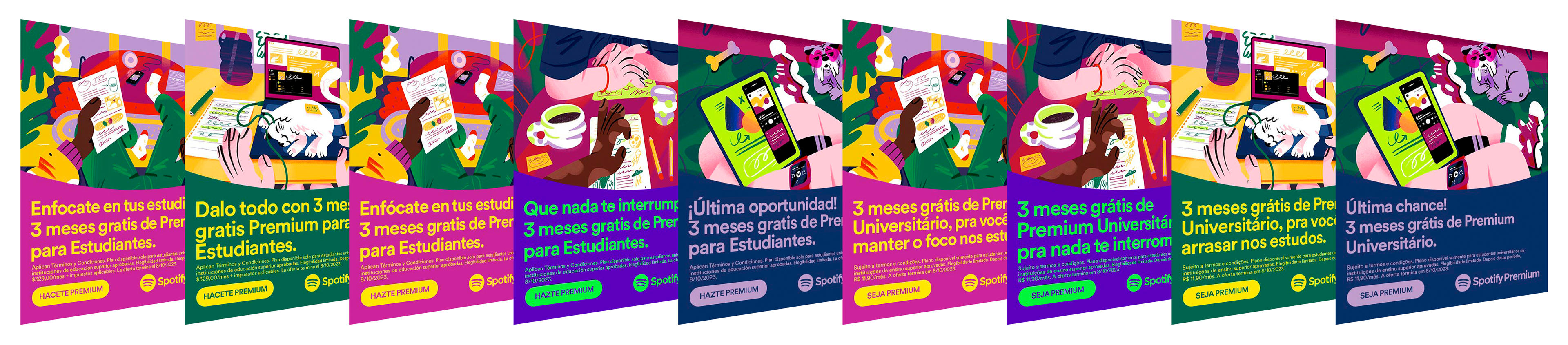 This project aims to portray the dynamic life of students, where studying and music come together within the world of Spotify Premium. The mission was to develop a series of illustrations capturing everyday student moments, exploring how different types of students find inspiration through their favorite songs.