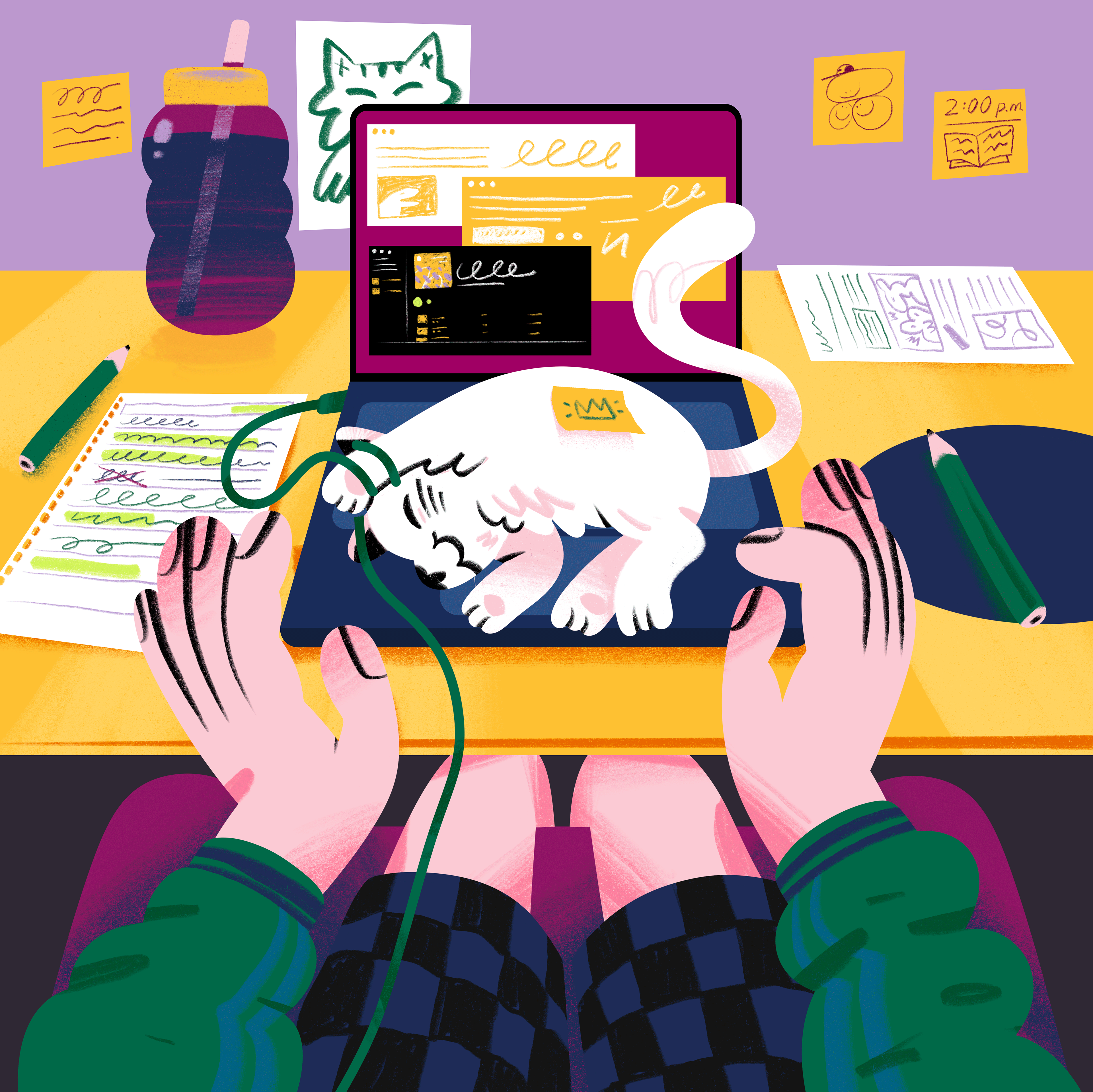 From laptops to coffee cups, from cats to colorful highlighters, sticky notes filled with reminders, and cozy socks that bring comfort during long study nights.